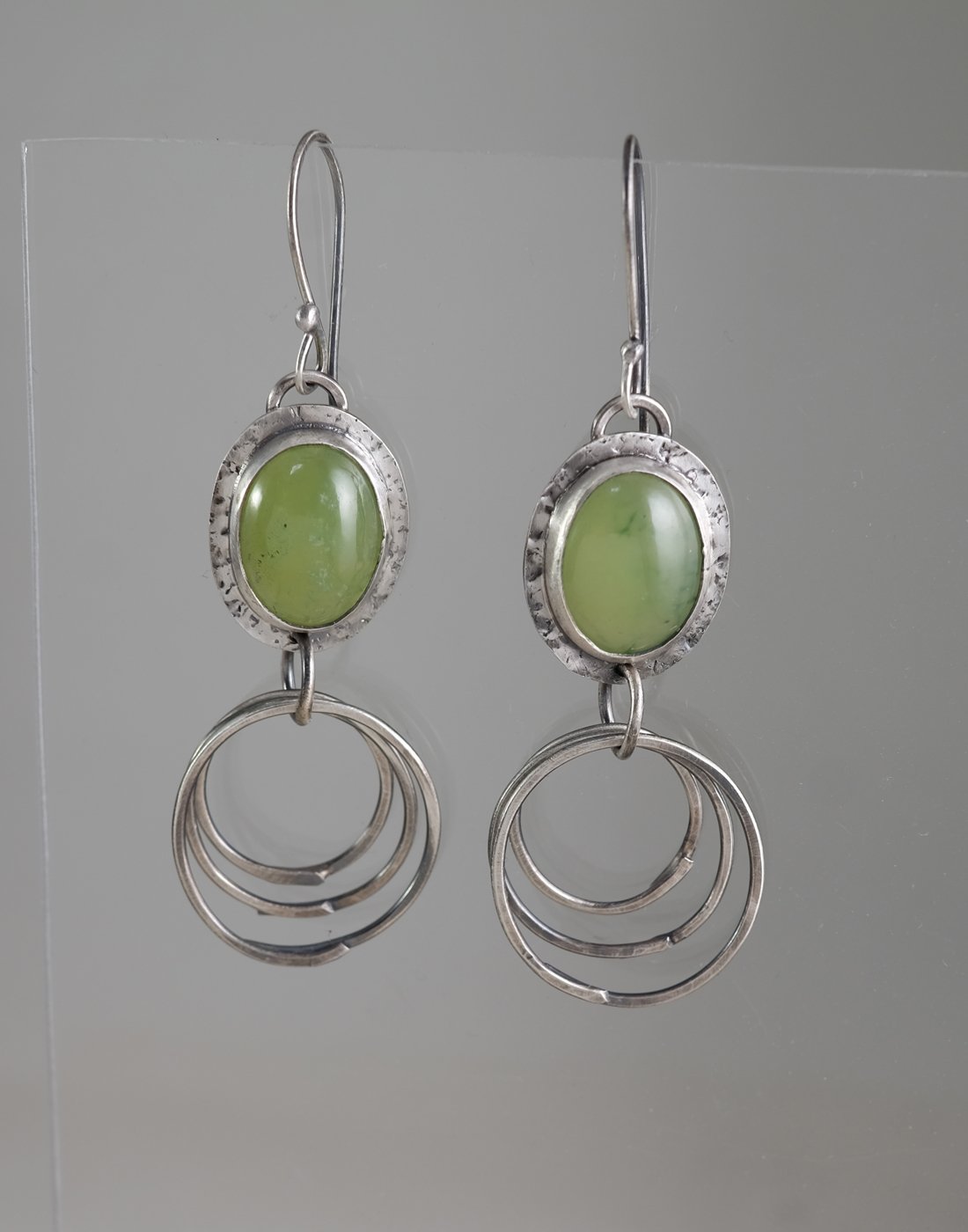 This is a fun pair of earrings, with slightly messy hoops. The Jade cabochons are bezel set on a cut out back to allow the light to show off the lovely, soft green color of the stones.